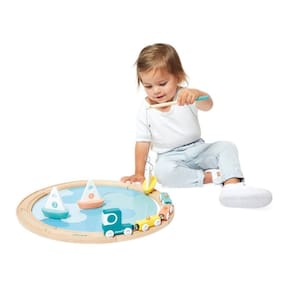 A pista, composta por 8 peças de madeira, circunda um encantador corpo d'água, enquanto um grande caminhão e seus 3 vagões magnéticos aguardam ansiosamente para içar os adoráveis barcos! Prepare-se para carregar e partir em novas aventuras! Este brinquedo estimula a imaginação e as habilidades motoras, mantendo seu pequeno entretido por horas. A vara de pescar é convenientemente armazenada na parte de trás da cabine quando não está em uso. Feito de madeira e cartão certificados pelo FSC®, este brinquedo de aprendizagem precoce da linha Bolid é não apenas divertido, mas também sustentável. Vamos explorar a beira da água com nossos lindos barcos à vela em tons pastel! Este jogo é perfeito para crianças a partir de 2 anos que adoram brincar com diferentes meios de transporte. A ideia é simples: comece montando as 4 grandes peças de cartão azul como um quebra-cabeça para criar o mar e, em seguida, coloque os 3 barcos à vela na água, prontos para emocionantes aventuras de pesca!