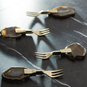 O conjunto de garfos para aperitivos é utilizado na mesa para servir queijos, frios e petiscos em geral. Possui o cabo em pedra ágata que é conhecido por sua beleza e resistência. A nobreza da ágata unido ao inox dourado, tornará seu evento ainda mais especial.