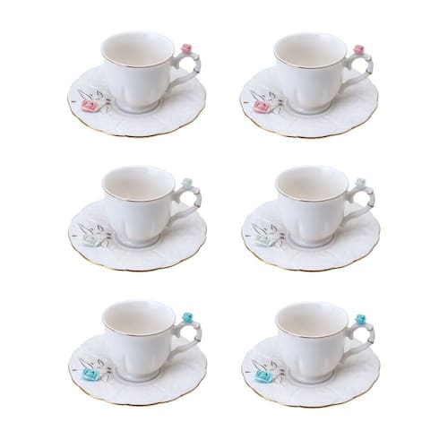 Cj 6 Xícaras P/Café C/Pires de Porcelana Branca Flower Design Plate Colorido 100ml Wolff