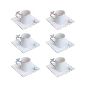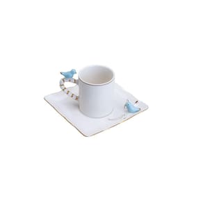 2 Xícaras P/Café C/Pires Quadrado Cute Birds Design Plate C/Pássaro Branco