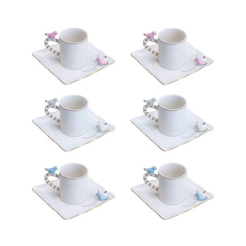 Conjunto 6 Xícaras Para Café Com Pires Quadrado Cute Birds Design Plate Colorido 90ml em porcelana são ideais para a melhor hora do dia, que é a do cafezinho. Com pires e xícara enfeitados com passarinho na borda, porcelana branca trabalhada e laterais douradas, ideais para servir o cafezinho à qualquer hora do dia.