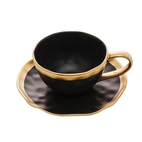 Cj 6 Xícaras P/Chá C/Pires de Porcelana Preto Fosco/Dourado Dubai 200ml Wolff