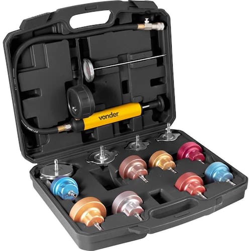 Conjunto composto por uma bomba para pressurizar o sistema de arrefecimento de veículos, para identificar possíveis vazamentos no sistema, vazamento no radiador, vazamento no reservatório de água, vazamento em mangueiras. Não realiza teste da tampa do reservatório de água.