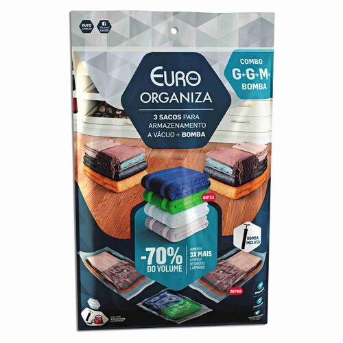Cjt organizador euro vacuo 4 pc g g m bomba vac9959 O organizador a vácuo da euro home é um item essencial para sua casa. Com ele, você organiza e armazena reduzindo o volume das peças em 70% e aumentando o espaço em seu armário ou mala em até 3 vezes mais. Além disso, os objetos guardados estarão protegidos contra umidade, insetos, odores e mofo. Com esse kit, composto por 2 organizadores tamanho g, 1 organizador tamanho m e 1 bomba de sucção a organização será muito mais prática e eficiente.