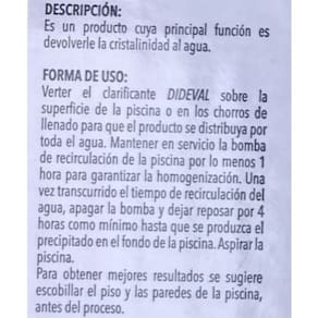 DESIGNAÇÃO CLARIFICANTE PARA PISCINAS DE BIDON 5 LITROS DIDEVALDOSIFICAÇÃO 1 LITRO DE PRODUTO POR CADA 20m3 (5º CC PARA CADA MIL LITROS DE ÁGUA). CAPACIDADE: 5 LITROSS Um produto cuja função é restaurar a cristalinidade da água. O clarificador de piscina é utilizado para corrigir água turva ou leitosa, mas não água verde, o que exigirá um tratamento antialgas. Obviamente, um algicida pode conter um agente clarificador em sua composição. USUÁRIO Despeje o clarificador Dideval na superfície da piscina ou nos jatos de enchimento para que o produto seja distribuído por toda a água. Mantenha a bomba de recirculação da piscina em funcionamento por pelo menos 1 hora para garantir a homogeneização. Após a recirculação da água, desligue a bomba e deixe descansar por pelo menos 4 horas até que o precipitado ocorra no fundo da piscina. Para aspirar a piscina. Para obter melhores resultados, sugere-se esmagar o chão e as paredes da piscina antes do processo. A clarificação da piscina é frequentemente utilizada após a realização de um tratamento específico (tratamento de choque, floculante, antialgas, etc.) que, embora tenha contribuído para equilibrar a água, alterou sua clareza. Também é utilizado quando a água fica turva devido à baixa dosagem de pH ou produto de desinfecção, após um tratamento de desinfecção por choque ou mesmo após uma simples tempestade que alterou o balanço hídrico. PRECAUÇÃO: EVITE O CONTATO DIRETO, irrita os olhos, produz tosse, dor de garganta e vermelhidão das náuseas
