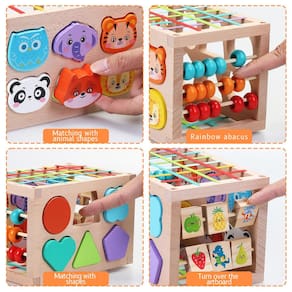-?CLASSIFICADOR DE FORMAS MONTESSORI?O cubo montessori de madeira contém 6 lindos animais de desenho animado e 6 blocos de formas em diferentes cores e formas. Esses blocos com padrões fofos e cores vivas podem aumentar o apelo das crianças.