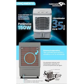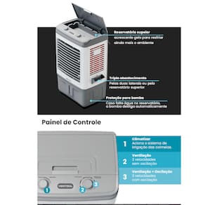 Econômico: Possui um consumo de apenas 150W Oscilação vertical e horizontal: Oscilação vertical automática, oscilação horizontal manual. Fácil transporte: Quatro rodas que facilitam a locomoção de um ambiente para o outro. Sistema evaporativo tipo Colmeia: O Sistema evaporativo com trocador de calor torna o ambiente mais fresco. Controle de Velocidade: 3 velocidades de ventilação. Proteção para bomba: Desliga automaticamente a bomba de água em caos de falta de água no reservatório