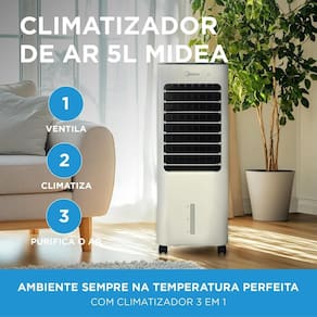 O Climatizador de Ar Frio Midea ACM52 5L 220V é um climatizador portátil desenvolvido para melhorar o conforto térmico em ambientes pequenos e médios. Ele possui função 3 em 1, permitindo ventilar, climatizar e umidificar o ar, ajudando a reduzir a sensação de calor e melhorar a qualidade do ar no ambiente.