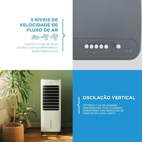 Com reservatório de 5 litros, filtro colmeia e três velocidades de ventilação, o equipamento distribui o ar de forma uniforme e pode ser facilmente transportado entre os cômodos da casa.