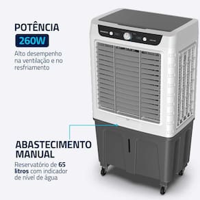 Climatizador Mondial CL-65L combina potência e praticidade para refrescar ambientes com mais conforto. Com 260W de potência, reservatório de 65 litros e 3 velocidades, ele ventila, umidifica, circula e climatiza o ar. Possui design moderno em branco e cinza, rodinhas para fácil transporte e opção de uso com água ou gelo, garantindo sensação de frescor natural com baixo consumo de energia.