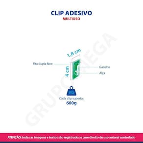 Características: Super fácil de usar e colar Feito com material atóxico Multiuso Adesivo dupla face, já fixado no clip Cada clip suporta até 600g Para superfícies lisas