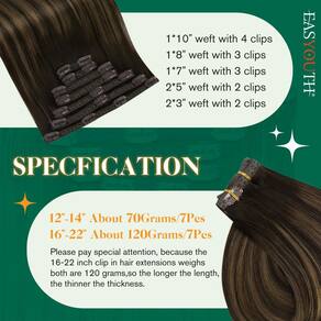 Extensões de cabelo Easyouth Clip in Hair Real Human Hair: As extensões de cabelo Easyouth Clip in Hair são feitas de cabelo 100% humano real. Adotamos tecnologia anti-queda para evitar que as extensões de cabelo caiam e se enrolem. Como aplicar extensões de cabelo com clipe: 1. Comece na parte inferior da sua cabeça na área da nuca, segmente uma seção do seu cabelo e use clipes de corte disponíveis aqui para separar o cabelo e cortar o cabelo. Os clipes são apoiados em silicone para maior aderência que pode proteger seu cabelo. 2. Faça isso novamente, seccionando seu cabelo cerca de 2,5 cm acima do último. 3. Aplique os pequenos pedaços em cada lado da sua cabeça, com clipes para serem colocados em cada lado da sua cabeça para equilibrar quaisquer camadas que você tenha em seu cabelo natural. 4. Use ferramentas de modelagem térmica em configurações baixas a médias e sempre use uma proteção contra o calor antes de alisar ou enrolar. Como cuidar do clipe nas extensões: 1. Escove suavemente com um pente de dentes largos ou uma escova de cerdas macias e vá de baixo para cima para remover quaisquer nós duros sem arrancar o cabelo. Depois, coloque suas tramas umas sobre as outras em um pacote para garantir que elas não se enrosquem com os clipes. 2. Aplique xampu nas extensões de cabelo. Segure a trama na parte superior, mergulhe-a na água e lave suavemente o cabelo com traços leves. Evite que eles se enrosquem e manuseie-os suavemente. Coloque cada trama cuidadosamente em uma toalha e repita o processo para cada trama. 3. Certifique-se de que eles permaneçam macios e hidratados aplicando uma máscara de cabelo ou condicionador profundo em cada trama de cima a baixo. 4. Enxágue cada trama e certifique-se de que não haja sensação escorregadia e macia após o condicionamento. 5. Depois de enxaguar as extensões de cabelo, esprema o excesso de água. Nunca esfregue com uma toalha para evitar emaranhados ou danos. Deixe secar ao ar livre e use uma toalha de microfibra de qualidade. - Material: Extensões de cabelo humano Easyouth feitas de cabelo humano Remy, pode ser enrolado ou alisado como cabelo natural, mas observe que não deve exceder 180 °C ao aquecer - Vantagens: com um design de renda, essas extensões são leves e respiráveis. O design dos clipes combina perfeitamente com a cor nas raízes do cabelo, criando uma mistura impecável, mais fácil de usar e tirar - Especificação: o grampo de cabelo humano em extensões contém 12 a 22 polegadas com um peso de 5 peças/70 g; 7 peças/120 g. Esta variedade permite que você encontre o comprimento e o volume ideais para qualquer penteado - Fácil e rápido de usar: você pode usar extensões de cabelo humano real por conta própria dentro de alguns minutos, e não há necessidade de contratar um cabeleireiro profissional para ajuda; até mesmo iniciantes podem aplicar facilmente as extensões de cabelo - : as extensões de cabelo Easyouth contêm , podem ser escolhidas de acordo com sua preferência, adequadas para todas as ocasiões, como casamento; festa; férias. Observe a ligeira diferença de cor entre o produto real e a imagem