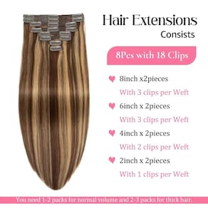 Detalhes das extensões de cabelo humano com clipe: Tipo de cabelo humano: clipe em extensões de cabelo humano real. Materiais de extensões de cabelo com clipe: 100% cabelo humano Remy. Comprimento: 35,5 cm, 40,6 cm, 45,7 cm, 50,8 cm, 56 cm, 61 cm disponíveis. Peso: 35.6 cm-90g, 40.6 cm-100g, 45.7 cm-100g, 50.8 cm-105g, 55.9 cm-110g, 61.0 cm-120g. Textura do cabelo humano: liso - ?Extensões de cabelo com clipe no material de cabelo humano real?: nossas extensões de cabelo liso são feitas de 100% cabelo humano virgem remy não processado. Nossas extensões de cabelo humano real com clipe são limpas/macias/saudáveis/sem queda/sem emaranhamento/sem química. O clipe em extensões de cabelo humano real é fácil de ser tingido/enrolado/reestilizado. Escolhemos cabelos de alta qualidade, tão bons quanto o seu próprio cabelo. - ?Grampo de cabelo humano em extensões?: extensões de cabelo humano com clipe, 8 peças 90-120 g com 18 clipes por conjunto. O comprimento para extensões de cabelo humano com clipe reto: 35.6 cm-90g, 40.6 cm-100g, 45.7 cm-100g, 50.8 cm-105g, 55.9 cm-110g, 61.0 cm-120g. De acordo com o volume do seu cabelo, geralmente 1-2 pacotes podem preencher toda a sua cabeça, aumentando o comprimento e o volume. Se você tem cabelo grosso, recomendamos comprar mais de 2 pacotes para alcançar um resultado perfeito - ?Vantagem das extensões de cabelo humano?: penteie facilmente, lave facilmente e cuide facilmente. Você pode usar facilmente e remover os clipes sozinho para mudar o penteado para diferentes ocasiões. Ao contrário das extensões de cabelo tradicionais com clipe reto, as extensões de cabelo sem fita não têm cola, não danificam o couro cabeludo e o cabelo, podem se misturar perfeitamente com a cor do seu cabelo. - ?Dicas de cuidados com extensões de cabelo com encaixe?: esfregue seu cabelo suavemente enquanto o lava. É necessário um pouco de xampu suave e condicionador de cabelo, depois lave com água morna e deixe secar naturalmente. Antes e depois do uso, lembre-se de escovar suas extensões de cabelo suavemente com uma escova de cerdas macias. - ?Serviço pós-venda e dicas de cores?: se você não ficar satisfeito com o produto de extensões de cabelo com clipe, por e-mail, faremos o nosso melhor para ajudá-lo a resolver o problema do produto rapidamente! As cores semelhantes à imagem real podem diferir ligeiramente das cores exibidas devido à iluminação, exibição e configurações