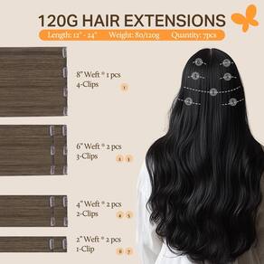2. Extensões de cabelo com clipes: conjunto de 7 peças de 120 g. Peso líquido de 105 g para cabelo sem clipes, 120 g para cabelo com clipes.