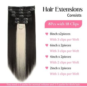 Detalhes das extensões de cabelo humano com clipe: Tipo de cabelo humano: clipe em extensões de cabelo humano real. Materiais de extensões de cabelo com clipe: 100% cabelo humano Remy. Comprimento: 35,5 cm, 40,6 cm, 45,7 cm, 50,8 cm, 56 cm, 61 cm disponíveis. Peso: 35.6 cm-90g, 40.6 cm-100g, 45.7 cm-100g, 50.8 cm-105g, 55.9 cm-110g, 61.0 cm-120g. Textura do cabelo humano: liso - ?Extensões de cabelo com clipe no material de cabelo humano real?: nossas extensões de cabelo liso são feitas de 100% cabelo humano virgem remy não processado. Nossas extensões de cabelo humano real com clipe são limpas/macias/saudáveis/sem queda/sem emaranhamento/sem química. O clipe em extensões de cabelo humano real é fácil de ser tingido/enrolado/reestilizado. Escolhemos cabelos de alta qualidade, tão bons quanto o seu próprio cabelo. - ?Grampo de cabelo humano em extensões?: extensões de cabelo humano com clipe, 8 peças 90-120 g com 18 clipes por conjunto. O comprimento para extensões de cabelo humano com clipe reto: 35.6 cm-90g, 40.6 cm-100g, 45.7 cm-100g, 50.8 cm-105g, 55.9 cm-110g, 61.0 cm-120g. De acordo com o volume do seu cabelo, geralmente 1-2 pacotes podem preencher toda a sua cabeça, aumentando o comprimento e o volume. Se você tem cabelo grosso, recomendamos comprar mais de 2 pacotes para alcançar um resultado perfeito - ?Vantagem das extensões de cabelo humano?: penteie facilmente, lave facilmente e cuide facilmente. Você pode usar facilmente e remover os clipes sozinho para mudar o penteado para diferentes ocasiões. Ao contrário das extensões de cabelo tradicionais com clipe reto, as extensões de cabelo sem fita não têm cola, não danificam o couro cabeludo e o cabelo, podem se misturar perfeitamente com a cor do seu cabelo. - ?Dicas de cuidados com extensões de cabelo com encaixe?: esfregue seu cabelo suavemente enquanto o lava. É necessário um pouco de xampu suave e condicionador de cabelo, depois lave com água morna e deixe secar naturalmente. Antes e depois do uso, lembre-se de escovar suas extensões de cabelo suavemente com uma escova de cerdas macias. - ?Serviço pós-venda e dicas de cores?: se você não ficar satisfeito com o produto de extensões de cabelo com clipe, por e-mail, faremos o nosso melhor para ajudá-lo a resolver o problema do produto rapidamente! As cores semelhantes à imagem real podem diferir ligeiramente das cores exibidas devido à iluminação, exibição e configurações