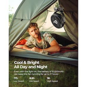 - [Lanterna LED e display digital] Eleve sua experiência de acampamento com nosso ventilador de acampamento com lanterna LED para iluminação. Mantenha-se informado com o display digital que mostra a velocidade do ar e o nível de potência. Desfrute de resfriamento e iluminação eficientes em um dispositivo conveniente para suas aventuras ao ar livre!