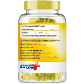 A Cloridrato de Betaina HCL é um aminoácido trimetilado obtido através da oxidação de colina na membrana interna da mitocôndria, quando exposta a desmetilações, ela dá origem à glicina, agindo nesse processo como um doador de grupamentos metil em diversas vias bioquímicas. Possui potencial para estabilizar a função metabólica das células em diferentes condições de estresse e com baixo gasto energético, sendo que tais propriedades osmoprotetoras relacionam-se a característica bipolaridade e alta solubilidade em água.BENEFÍCIOSA Cloridrato de Betaina HCL é uma fonte de ácido clorídrico que atual diminuindo o pH estomacal e auxiliando na má digestão, principalmente em dietas ricas em proteínas e gorduras. Tem um papel fundamental no processo de digestão, funcionando como um reforço do seu suco gástrico. Se você sofre de azia, refluxo ou desconforto estomacal a betaína cloridrato, em muitos casos, pode ajudá-lo a eliminar a causa do seu problema de maneira natural.Modo de usar: Tomar 1 Cápsula Com Uma Refeição, Até Três Vezes Ao Dia. Não Tomar Com O Estômago Vazio.Advertência: Não Serve Para Utilização Por Mulheres Grávidas, Que Possam Engravidar, Ou Amamentando. Se Ocorrer Uma Sensação De Queimação, Interrompa O Uso, Ou Use Com Menos Frequência. Se Tiver Úlceras Estomacais Ou Duodenais, Ou Estiver Tomando Remédios Que Possam Causar Úlceras, Não Tomar Este Produto.