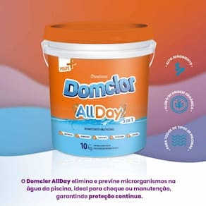 Elimina e previne microrganismos na água da piscina, ideal para choque ou manutenção, garantindo proteção contínua. Para utilização em manutenção do cloro na água: aplique 5 gramas de Domclor AllDay para cada m 1000 L de água. Para utilização como choque: aplique 20 gramas de Domclor AllDay para cada m 1000 L de água, dissolvendo o produto com água em um balde plástico previamente limpo e aplicando ao longo do perímetro da piscina Marca: Não Informado