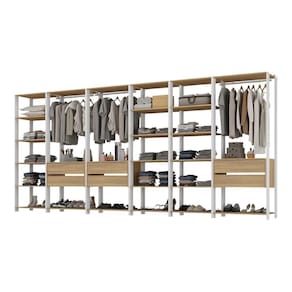 O closet é equipado com 21 prateleiras espaçosas (suportam até 8kg em cada), ideais para acomodar suas roupas e calçados favoritos com estilo e organização inigualáveis. Os cabideiros de madeira revestidos garantem que suas roupas, sejam longas ou curtas, fiquem sempre impecáveis. Além disso, com 6 gavetas que possuem corrediças metálicas, o manuseio dos seus pertences ganha leveza e praticidade. Valorize cada peça do seu vestuário com um design aberto e moderno que realça qualquer espaço.