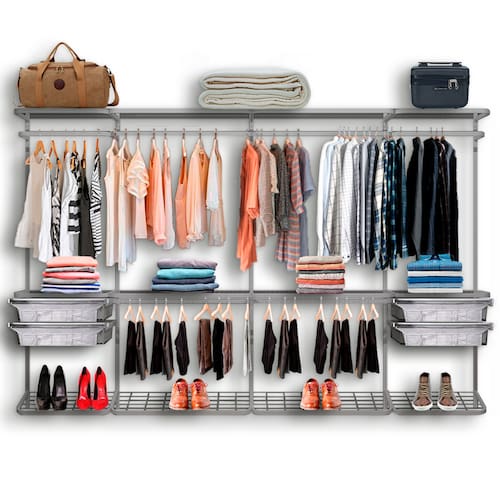 Este produto possui uma configuração casal, contendo cabideiro com dois níveis interrompidos por prateleiras. As gavetas aramadas possuem um fechamento com tampo em mdf. Você poderá brincar com as peças intercambiando entre módulos ou mudando a altura da peças.