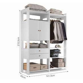 Obs: Material - 100% MDF - 2 gavetas com corrediças telescópicas- 2 portas (também pode ser montado sem as portas) - 1 prateleira interna (também pode ser montado sem a prateleira) - 1 cabideiro de metal - Diversas prateleiras com espaço para roupas, sapatos, roupas de cama, malas, e objetos pessoais.