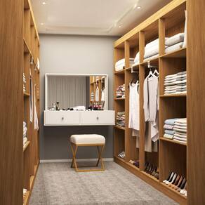 O(a) Closet Casal em L Ele e Ela 4 Metros 16 Prateleiras 4 Cabideiros Cinamomo Fosco - Loja é produzido em MDP na escala de brilho Semi-Fosco, e possui um grau de dificuldade de montagem: Médio.