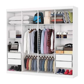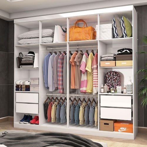 Closet Casal Rubi 4 Gavetas Branco O Closet Casal Rubi com 2,07m de altura, 2,08m de largura e 0,47m de profundidade. Combinado com 4 gavetas, 4 prateleiras, 1 cabideiro e 1 calceiro, deixa o produto com uma divisao funcional capaz de proporcionar ao cliente acomodar todas as suas roupas de maneira mais organizada e com maior visibilidade. Nos maleiros cabem certinhos edredons, cobertores, travesseiros, malas, toalhas, bolsas, entre outros. As Prateleiras sao ideias para colocar roupas de cama e de banho, perfumes, kits de maquiagem, caixinhas com acessorios e bolsas menores. As quatro gavetas fixadas sobre corredicas metalicas, sao otimas para guardar blusas dobradas, shorts, malhas e roupas intimas. Estrutura do produto em MDP.