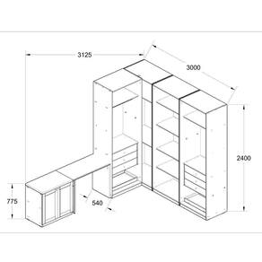 Dimensões: Mesa Escrivaninha: 77,5 x 100 x 50 cm Sapateira: 77,5 x 79,22 x 50,20 cm Closet módulo canto: 240 x 135 x 85 cm Closet módulo maior: 240 x 159 x 56 cm