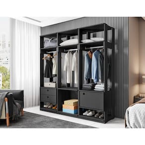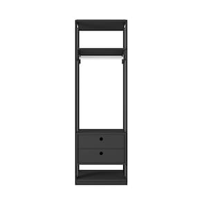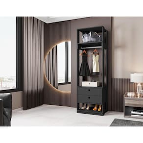 Funcional e moderno, o closet aberto é multiuso e pode ser utilizado de várias formas otimizando o ambiente e trazendo elegância. Este Módulo Titan possui um cabideiro para organizar as roupas, duas gavetas de corrediças telescópicas e dois nichos para organizar objetos pessoais, com o de baixo podendo ser utilizado como sapateira.