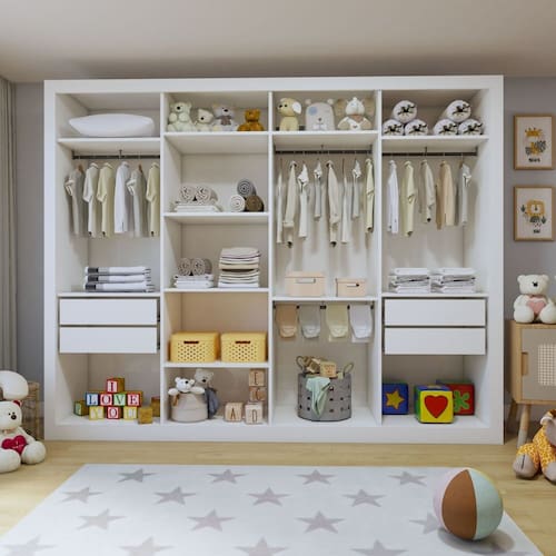 O closet infantil tem espaço para roupas, brinquedos e muito mais.