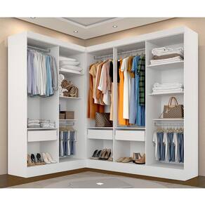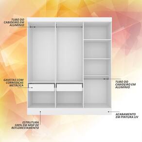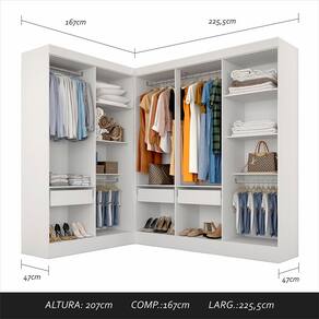 Descrição do Produto - MDP 12mm e 15mm - Acabamento em Pintura UV - Tonalidade: Branco - Cabideiros: Em Alumínio - Gavetas com Corrediças Metálica - Prateleiras suportam até 5kg distribuídos- Gaveta suporta até 5kg distribuídos OBS: NÃO possui portas