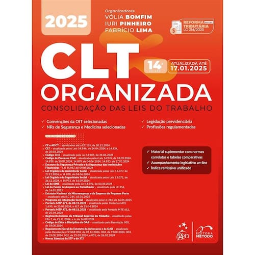 A CLT Organizada, em sua 13 edição, sob a coordenação dos professores Vólia Bomfim, Iuri Pinheiro e Fabrício Lima, oferece diversos facilitadores de usabilidade, consulta e manuseio para acompanhá-lo na sua rotina de estudos, provas e prática profissional. MUITAS VANTAGENS PARA VOCÊ! > Seleção e organização de normas trabalhistas > Notas remissivas a artigos, diplomas legais e súmulas > Índice cronológico geral com todos os diplomas legais da obra > A melhor experiência de consulta: Índice Alfabético-Remissivo Unificado > Material suplementar on-line: + normas e tabelas comparativas NOVO PROJETO GRÁFICO PRÁTICO E MODERNO para oferecer: > Mais remissões no texto da CLT: notas com transcrição de artigos e súmulas relacionadas > Facilitadores para busca e localização das normas: Artigos e leis nos cabeçalhos em destaque Tarjas identificadoras das seções da obra As mais recentes atualizações legislativas destacadas em boxes A CLT Organizada da Editora Método é ideal para estudo e consulta em provas da OAB, graduação, concursos públicos e no seu dia a dia como profissional da área. Marca: EDITORA METODO
