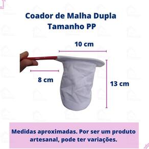 - coador reutilizável; - confeccionado em algodão 100%; - malha dupla; - haste e aro confeccionados em arame galvanizado; - comprimento do cabo: 8 centímetros padrão para todos os tamanhos - altura do coador: pp 13 cm , p 18 cm , m 22 cm , g 26 cm e gg 32 cm ; - largura do coador: pp 10 cm ; p 12 cm , m 14 cm , g 16 cm e gg 18 cm .