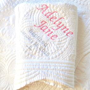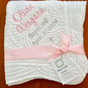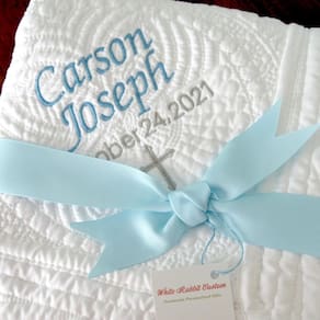 Uma linda e elegante colcha de batismo celebra o nascimento de uma criança. Este cobertor é muito macio, acolchoado e bordado profissionalmente. Eu bordei o nome da criança, a data e o nome do evento abençoado em um canto da colcha. Uma linda cruz está incluída em seu design ou você pode optar por não incluí-la. Você também pode adicionar o nome da igreja ou uma nota pessoal que será exibida em um segundo canto para um presente verdadeiramente pessoal. Somos especializados em colchas personalizadas de batismo e batizado e tomamos o cuidado de criar uma linda lembrança para seu filho especial. Enviamos cada item embrulhado em fita de gorgorão de alta qualidade e, em seguida, inserimos cuidadosamente em embalagens seguras para crianças. Esses cobertores são lindamente lavados e se tornarão uma lembrança querida por muitos anos. - As colchas são de branco puro com bordados elegantes usando cores coloridas. A colcha Eash chega embrulhada em fita de gorgorão e enviada em uma embalagem segura para bebês - Inclui data, cruz e nome da ocasião especial - Edredão leve tamanho berço