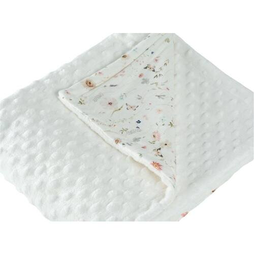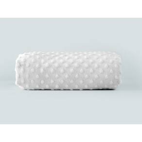 Características: De um lado em fleece com relevo poá, na cor off white. Outro lado em suedine estampado fundo off white.