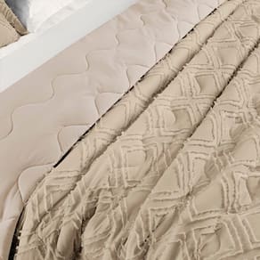 Cobre Leito Aveline Queen 03 Peças - Caqui O Cobre Leito Aveline, com sua paleta de cores neutras, adiciona um toque de sutileza e classe à decoração. Feito com tecido Micropercal de 300 fios e seu composê liso de Micropercal 200 fios, sua qualidade é inegável, proporcionando uma sensação de suavidade ao toque. O acabamento em 3D no tecido é o detalhe que faz toda a diferença. Cada linha e textura criam uma profundidade visual que transforma o cobre-leito em uma verdadeira obra de arte têxtil. Combine o Cobre Leito Aveline com as almofadas da mesma coleção para um visual completo e sofisticado em seu quarto. O que vai na embalagem: 01 Cobre leito 2,60m x 2,40m02 Porta travesseiros 80cm x 55cm | medida útil: 70cm x 50cm Composição: Tecido: Superior e Inferior 100% PoliésterEnchimento: 100% Poliéster.