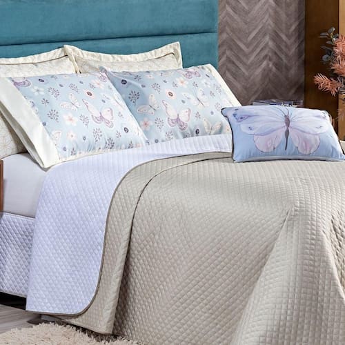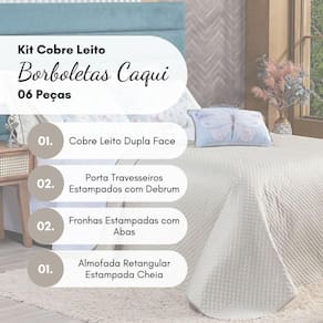 Apresentando o Kit Cobre Leito Borboletas Caqui em Dupla Face com Almofada, perfeito para adicionar um toque de elegância e conforto ao seu quarto. Este conjunto inclui seis peças cuidadosamente selecionadas para transformar o ambiente do seu dormitório. A estampa de borboletas em cores de tons suaves oferece um visual encantador, enquanto a versatilidade da face dupla permite que você alterne entre os estilos conforme sua preferência. O kit é composto por um cobre leito acolchoado, dois porta-travesseiros estampados com debrum, duas fronhas decorativas com abas laterais e uma almofada retangular estampada elegante, proporcionando um conjunto completo de elementos coordenados para a sua cama. Combinando estilo e funcionalidade, este kit adiciona um toque de sofisticação e conforto ao seu espaço de descanso. Confira!