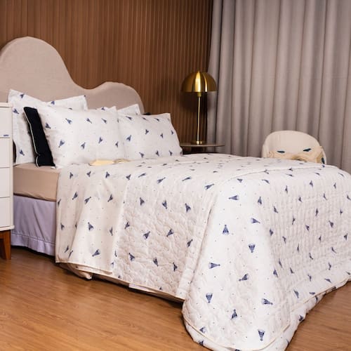 Obrigado por visitar nossa loja, temos os melhores produtos de cama, mesa e banho para sua casa com a melhor qualidade e variedade em diversos modelos, todos são rigorosamente revisados.Contém:01 Cobre leito estampado com 2,55m x 2,45m02 Porta travesseiros estampados com 0,7m x 0,5mComposição:Tecido 150 fios 67% Algodão 33% PoliésterTecido de baixo (forro) 100% poliesterEnchimento: Manta resinada 100% PoliésterIdeal para cama casal queen ou padrão. Forrado em tecido.As fotos são ilustrativas, as cores podem variar de acordo com cada monitor e não representam todas as peças que compõem na foto do produto.Muito obrigada pela sua visita e boas compras.