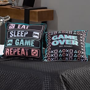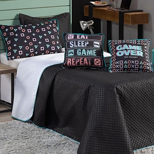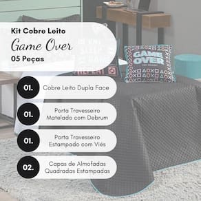 Apresentamos o Kit Cobre Leito Game Over, perfeito para os apaixonados por games e estilo moderno. Este conjunto oferece cinco peças cuidadosamente selecionadas para transformar o quarto do seu jovem gamer. Com um design divertido inspirado em jogos e video-games marcantes, este kit traz uma vibe contemporânea e descontraída ao ambiente. A face dupla proporciona versatilidade, permitindo que você alterne entre os estilos conforme desejar. O kit inclui um cobre leito acolchoado, porta-travesseiros matelado e estampado e duas capas de almofadas estampadas temáticas, garantindo uma cama confortável e estilosa. Combinando personalidade e conforto, este kit é a escolha ideal para quem busca criar um espaço único e acolhedor para os fãs de jogos. Confira!