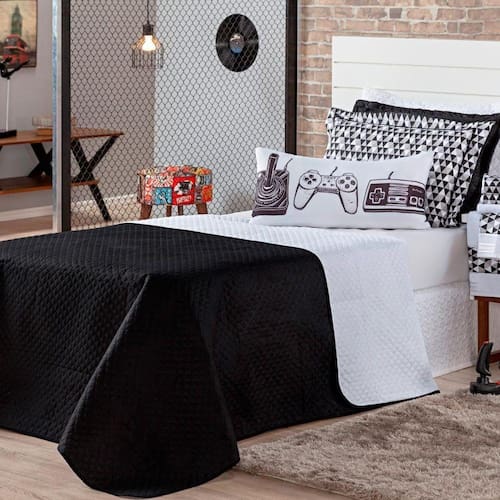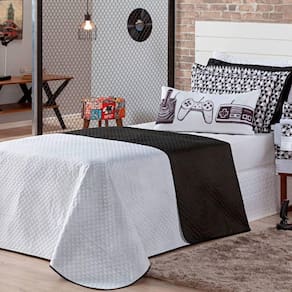 A Coleção Anos 90 Solteiro em Microfibra tem um toque suave e macio. O tecido caracteriza-se por ser muito leve, confortável, sedoso, com secagem rápida e ótimo caimento. Vem trazendo estilo para a decoração de seu quarto, ficará de ótimo bom gosto e elegância. Confira! Contém 01 Cobre Leito 2,15m X 1,60m 01 Porta Travesseiro Liso (Preto) 70cm X 50cm 01 Porta Travesseiro Estampado 70cm x 50cm 01 Almofada Retangular c/ Refil 30cm x 60cm Composição: Tecido Poliéster: 100% Poliéster Microfibra T