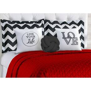 Contém: 01 Cobre Leito 2,60m x 2,40m 02 Porta Travesseiro Chevron 75cm x 55cm 02 Almofadas Bordadas 38cm x 38cm 02 Refis de Almofadas 01 Almofada Nó irregular
