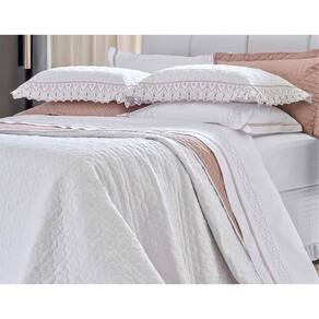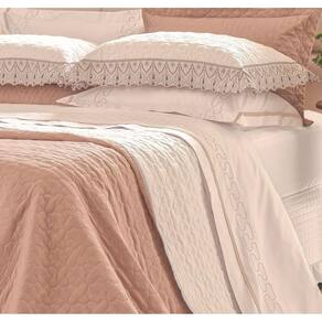 Combinação incrível de cores clássicas com o delicado bordado do matelassê e da laise. A harmonia de uma coleção singela e impactante que une a laise clássica ao matelassê delicado e moderno. O toque final fica pelo contrate de cores do cobre leito, requinte e harmonia em qualquer ambiente. O que vem na embalagem: 01 Cobre leito Bordado Dupla Face 2,60 x 2,80m 02 Porta Travesseiros com Laise 75cm x 55cm Cor: Face 1: Branco Face 2: Rosê Composição Tecido: Face 1 e Face 2: de Poliester 100% Poliester Mais praticidade! Fácil de lavar e não é preciso passar!!