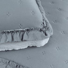 Acompanha porta travesseiros coordenadas com o mesmo acabamento e babados, garantindo uma composição harmoniosa.