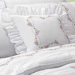 Contém: 01 cobre leito bordado 2,60mx2,40m 02 Porta travesseiros detalhe em lase 75cmx75cm 01 Capa de almofada Bordado Floral e detalhe em lase 45cmx45cm 01 Refil de almofada 40cmx40cm 01 Rolo com bordado floral e detalhe em lase tamanho irregular