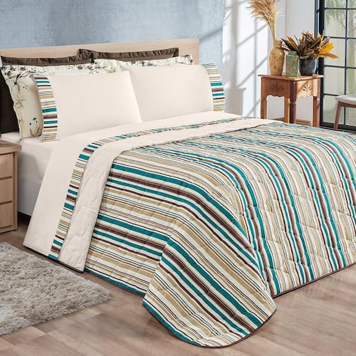 Produto composto por: 01 cobre leito dupla face 2,60m x 2,40m 02 porta travesseiros estampados 70cm x 50cm área útil com aba americana Composição do kit Tecido superior percal 180 fios 80% algodão 20% poliéster Manta 100% poliéster Tecido inferior percal 180 fios 80% algodão 20% poliéster Ean: 7908565904265