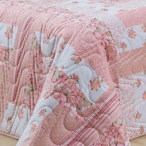 O cobre leito Colori é ideal para compor uma decoração de quarto romântica e delicada. O conjunto é composto por cobre leito dupla face matelassado de um lado com estampa e do outro lado liso e acabamento com viés em toda borda junto de porta travesseiro matelassado estampado, debrum (abas) e fechamento em modelo envelope (não possui zíper). Todos itens são fabricados com tecido percal 200 fios 100% poliéster que recebe um tratamento especial para ser extremamente macio ao toque, não desbota nem forma bolinhas com o uso e lavagens.