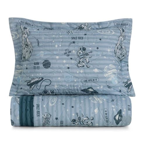 Cobreleito Casal Espacial 200 Fios Karsten Cobreleito Casal 200 Fios Karsten O jogo de colcha Espacial é uma explosão de criatividade e conforto. De um lado, o astronauta rockstar se apresenta em uma cena vibrante no espaço; do outro, uma padronagem listrada com estrelas garante versatilidade para diferentes composições. O porta-travesseiro acompanha o tema, reforçando a unidade visual. Com acabamento em matelassê e enchimento leve, esse conjunto é ideal para deixar o quarto mais lúdico e estiloso, sem abrir mão da praticidade no dia a dia. Contém:1 Cobreleito dupla face. Tamanho: 2,20m x 2,60m2 Porta Travesseiros com 3 abas. Tamanho: 50cm x 70cm. Composição: 200 fios, 100% algodão, Enchimento 100% PoliésterEstampa: EspacialMarca: Karsten Marca: Não Informado Ean: 7890254931242