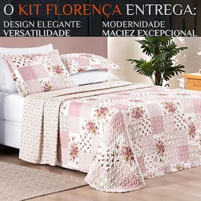 Fácil de cuidar e perfeito para o uso diário, o Cobreleito Florença é prático e versátil. Seu tecido de 200 fios garante durabilidade e conforto, enquanto o design de três peças 1 cobreleito + 2 porta-travesseiros oferece um visual completo e sofisticado para a sua cama.