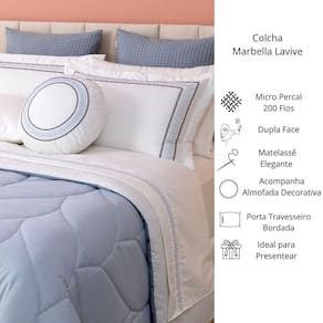 O cobreleito é dupla face e está disponível em diversos tamanhos, desde solteiro até super king. Renove o seu quarto com estilo e sofisticação com a Coleção Marbella da Madrigal Enxovais.
