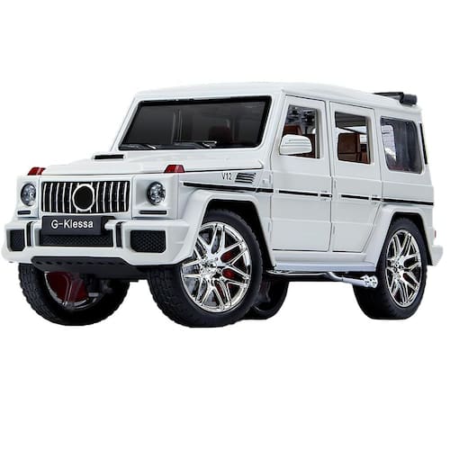 Modelo de coche coleccionable de fundición de aleación con función de retroceso para niños y adultos. - ?Calidad Premium y Seguridad?El modelo de coche G63 fundido a presión está hecho de materiales de aleación y neumáticos de goma, lo que lo hace seguro para que los niños jueguen. Presenta detalles interiores y exteriores muy detallados, muy resistente y duradero. - ?Tamaño?Escala 1/24, 20,5 x 9,5 x 8,5 cm, peso aproximado 520 gramos. El modelo de coche con embalaje atractivo es ideal para que los niños pequeños jueguen y lo transporten. Ayuda a los niños a aprender más sobre automóviles, ampliar sus conocimientos, mejorar la coordinación mano-ojo y la velocidad de reacción durante el juego. - ?Función?No requiere baterías, pero el vehículo tiene una potente función de retroceso. Simplemente empújelo hacia atrás y suéltelo; el coche avanzará una larga distancia. Cuenta con tres posiciones de cambio: en segunda velocidad se encienden las luces delanteras y traseras; en tercera velocidad, al presionar las dos ruedas delanteras, se activan breves efectos de sonido y luz, muy atractivo tanto para niños como para coleccionistas. - ?Colección?Para quienes aman coleccionar modelos de coches, este modelo es sin duda un tesoro raro. Cada detalle ha sido cuidadosamente pulido; el interior es muy realista. Los detalles internos y externos del modelo hacen referencia al coche real, tallados y fabricados con gran calidad. Los coleccionistas apreciarán su tamaño perfecto, que permite coleccionar una serie completa sin ocupar demasiado espacio. - ?Regalo Ideal?Este coche metálico es perfecto para cumpleaños, regalos de Navidad, decoraciones de fiestas y pasteles. Puede ser un premio valioso para niños. Ya sea para coleccionarlo usted mismo o para regalar a amigos y familiares, este coche de juguete es un regalo único y significativo.